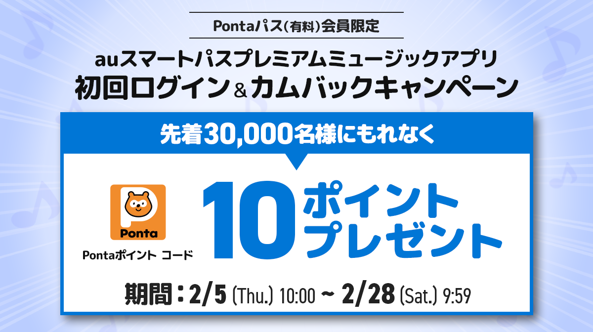 本キャンペーンへのご参加は最新バージョンのauスマートパスプレミアムミュージックアプリをご利用ください。Pontaパスアプリではございません。