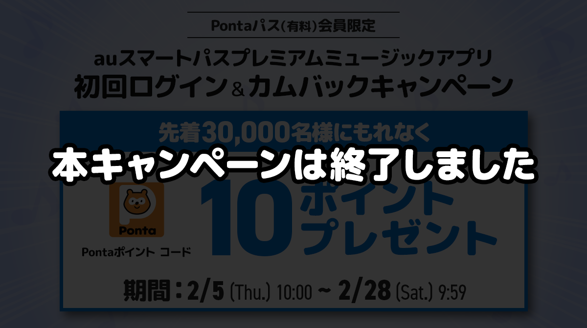 本キャンペーンへのご参加は最新バージョンのauスマートパスプレミアムミュージックアプリをご利用ください。Pontaパスアプリではございません。