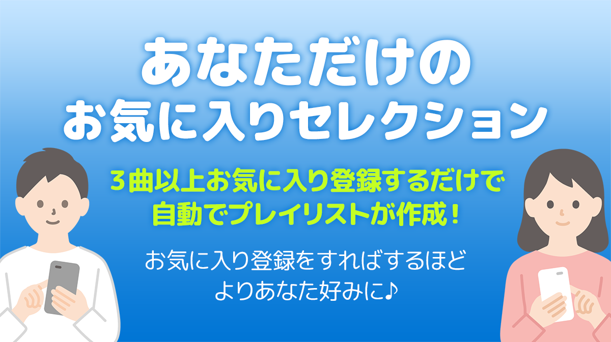 使い方はとっても簡単!お気に入り曲を3曲以上登録するだけで、お気に入り曲とおすすめ曲の組み合わせプレイリストが自動で出来上がり。お気に入り楽曲を登録すればするほど、よりお楽しみいただけます。ぜひお試しください!