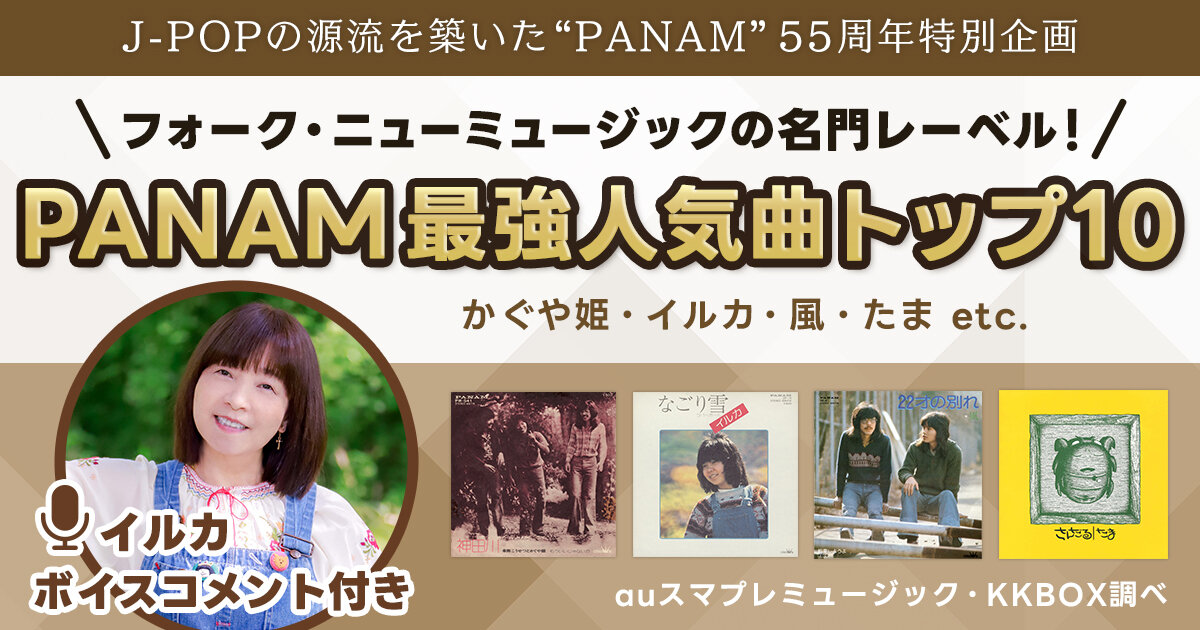 auスマプレミュージック・KKBOXをお聞きのみなさん、こんにちは。イルカです。このたび、私イルカが所属するレーベル “PANAM” が創設55年を迎えたことを記念しまして、auさんの音楽サブスク・auスマプレミュージックさんと、台湾発の音楽サブスク・KKBOXさんの共同企画で “PANAM” 最強人気曲トップ10と題した特別企画を実施されたということで。