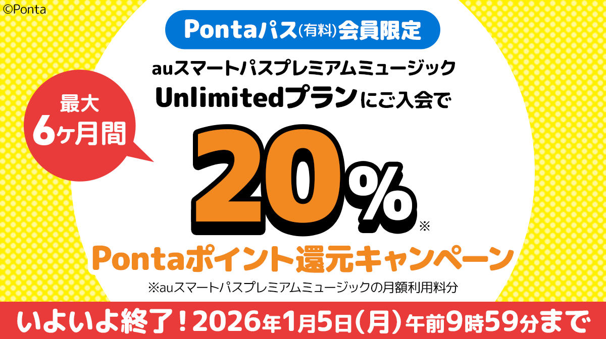 Pontaパス(有料)会員のお客様がキャンペーン期間中にauスマートパスプレミアムミュージックのUnlimitedプランにご入会いただくと、月額利用料(税込980円)の20%をPontaポイントで最大6か月間還元いたします。(最初のお支払い発生月は日割り額の20%となります。)