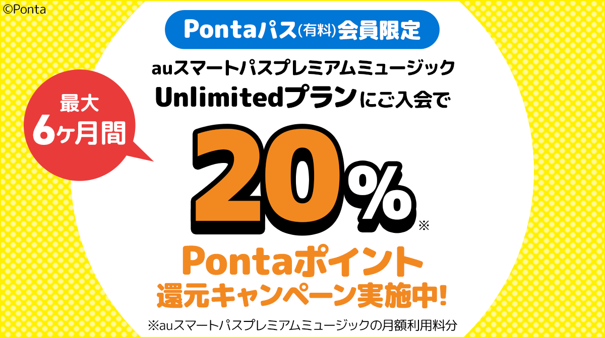 Pontaパス(有料)会員のお客様がキャンペーン期間中にauスマートパスプレミアムミュージックのUnlimitedプランにご入会いただくと、月額利用料(税込980円)の20%をPontaポイントで最大6か月間還元いたします。(最初のお支払い発生月は日割り額の20%となります。)