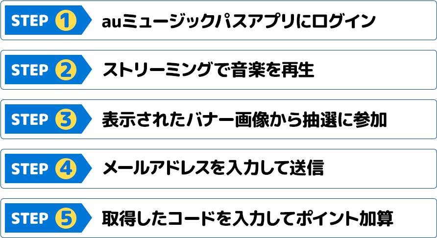 キャンペーン期間中にauミュージックパスアプリでお好きな楽曲をストリーミング再生(データ通信が発生する音楽再生)後に表示されたバナー画像から抽選に参加してください。