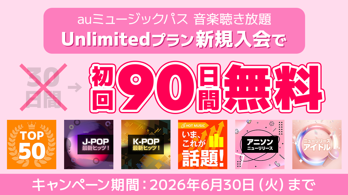 キャンペーン期間中に「auミュージックパス Unlimited プラン」に初めてご入会いただきますと、90日間の無料トライアル期間が適用されます。